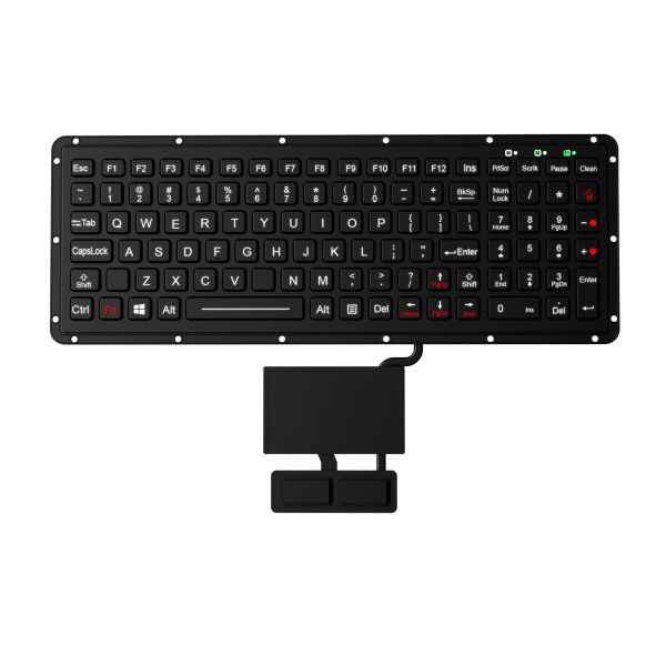 Introducing the EMC Keyboard –102 keys IP65 dynamic sealed & ruggedized silicone rubber military keyboard with sealed tough touchpad with 400DPI resolutions for fast cursor position, with numeric keypad on the right side of keyboard and 12 function keys on top line for easy operation, using reinforced special membrane switch key technology with key stroke (1.20mm) with extremely good tactile feeling for fast and accurate data input without any noise and error output, accurate and fast input, there will be no key value missing, no stuck key, no repeated key value output during the keyboard operation, The keyboard built-in ultra-thin metal frame and ultra-thin metal reinforcement bottom plate combine the keyboard seal reinforcement into a professional whole, with durable coating & anti-microbial keyboard surface withstand to most chemicals and liquids under harsh environment, FN + Clean combination key for easy cleaning via lock/disable whole keyboard without needing to take away the keyboard from PC, panel mount with super thin ruggedized aluminum back plate with mounting holes, adjustable white backlight included. Embedded installation mode. Which meet MIL-STD-461G (EMC, EMI, EMS, ESD) and MIL-STD-810F (wide temperature, shock, salt mist, vibration, fungus, humidity etc.). Which can also meet the critical military standards in these 10 aspects: reliability, safety, maintainability, testability, supportability, environmental adaptability, stability, compatibility, consistency, and continuity.